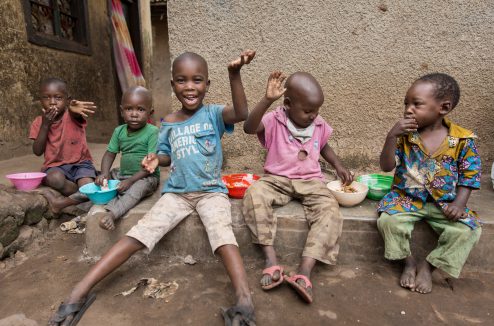 An older woman wearing a long floral dress looks over to the children sitting in front of her big brick house. Each child is holding bowls filled with a mixture of silverfish, rice, and vegetables. Giggling between each mouthful, the children happily enjoy their lunch on a warm afternoon in Kampala, Uganda.
